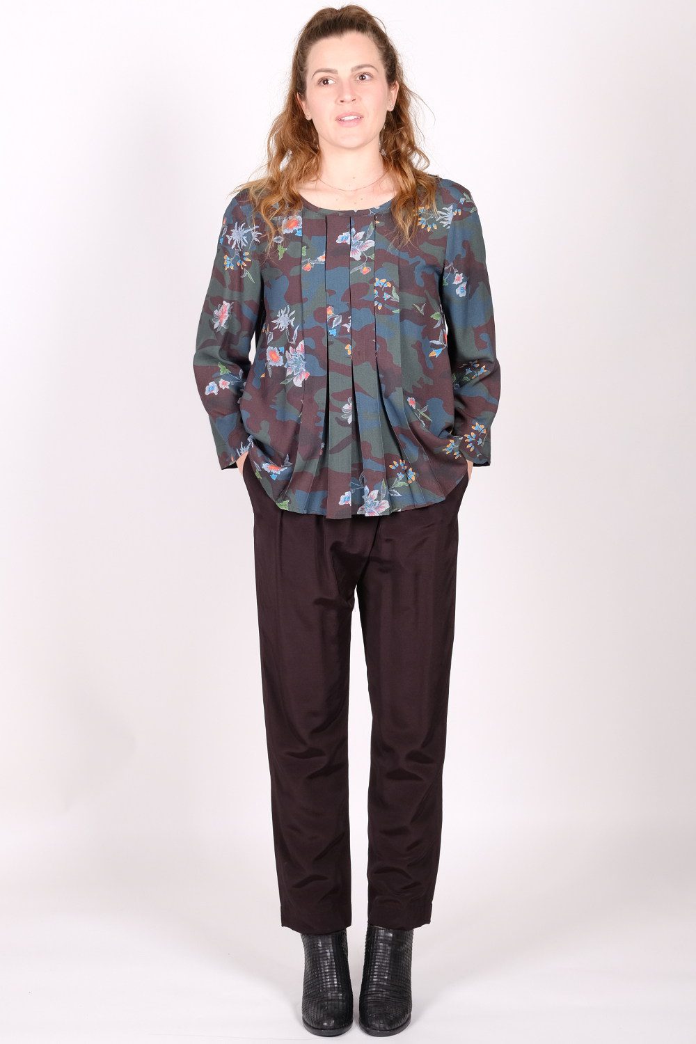 Wallace Rose Alisha 100% viscose khaki floral print, pleat front, long sleeved, easy fitting top with back neck tie and box pleat detail. Worn with Wallace Rose Patty 100% viscose pleat front elasticated waist ankle length trouser.