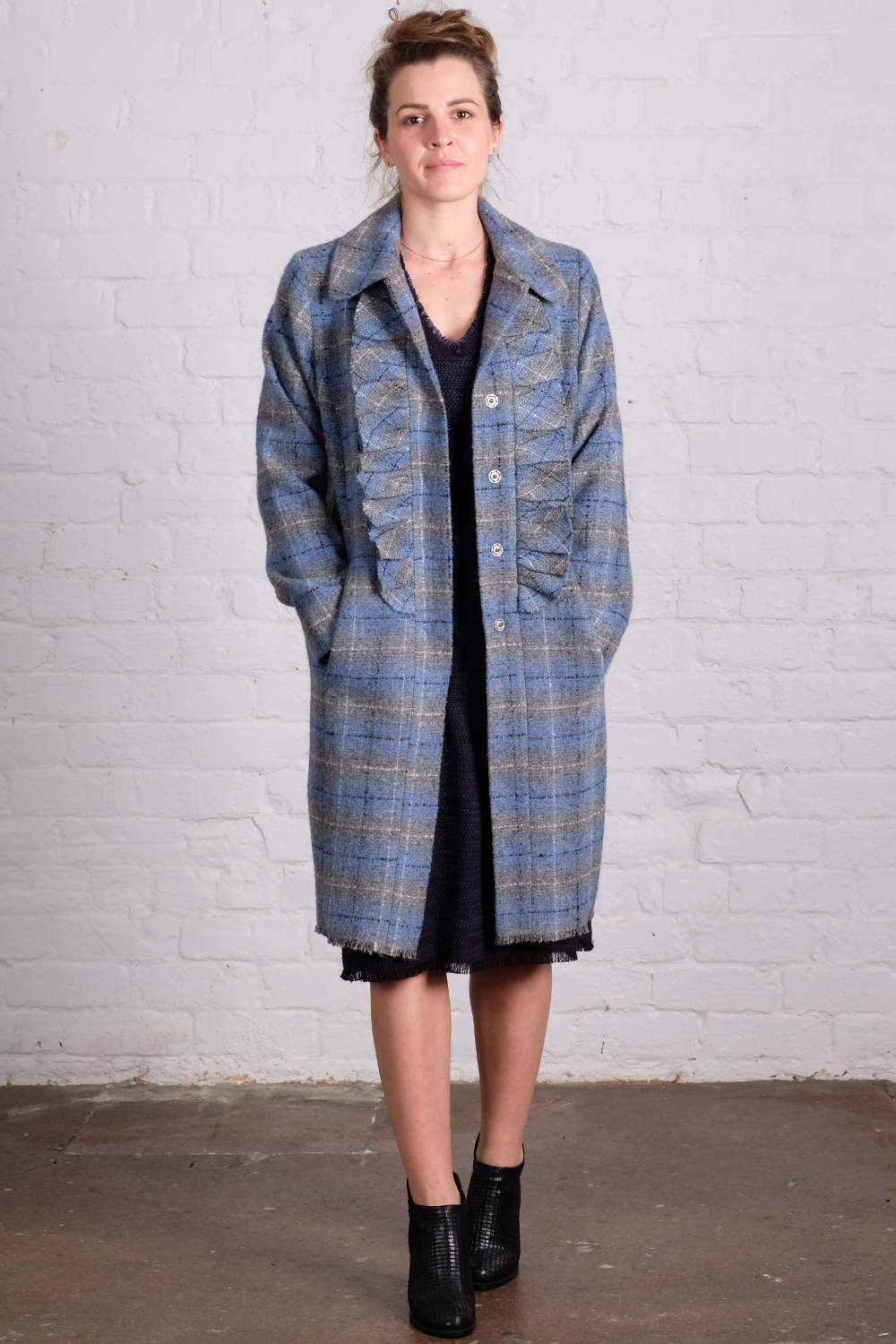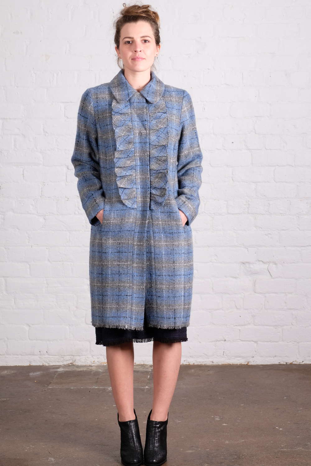 Alisha 100% wool blue and grey plaid fitted coat with front ruffle panel.