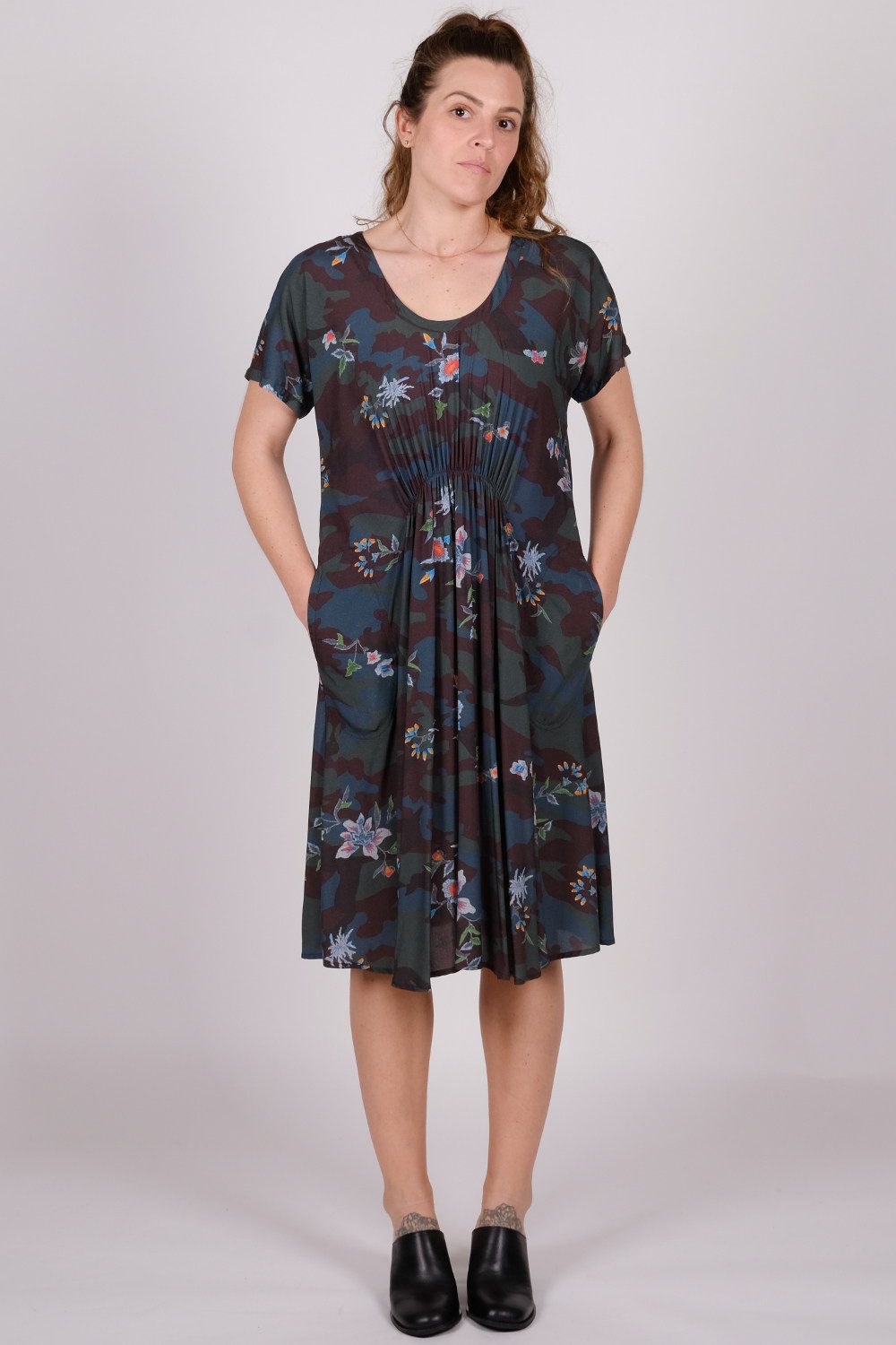 Wallace Rose Anya 100% viscose khaki floral print shift dress with front gathering, side pockets and button back detail.