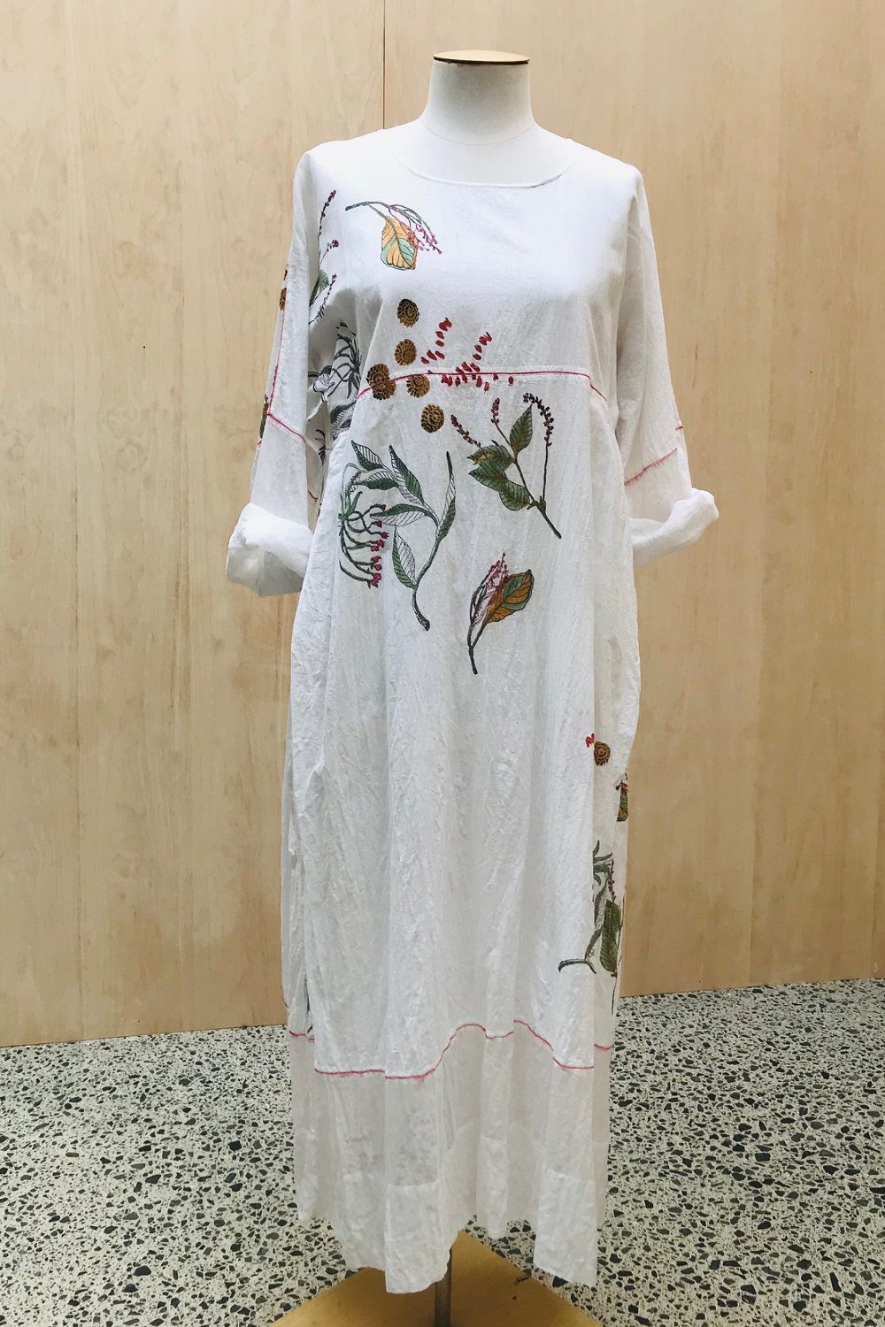 Imported Artisan Range 50/50 cotton & silk hand printed kaftan dress with side pockets, contrast red stitch detail, and sheer panel inserts.