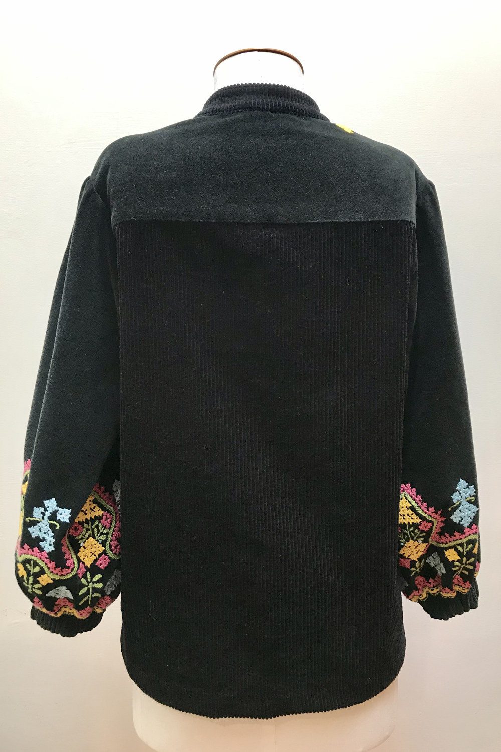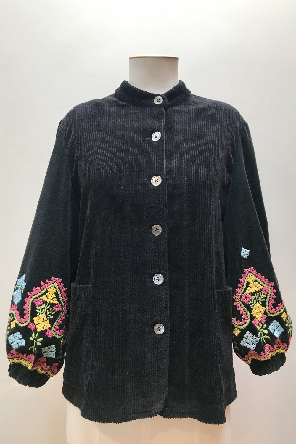 Wallace Rose Biba 100% cotton cord causal unlined short coat with patch pockets, mandarin collar and feature cotton velvet gathered and embroidered sleeve.