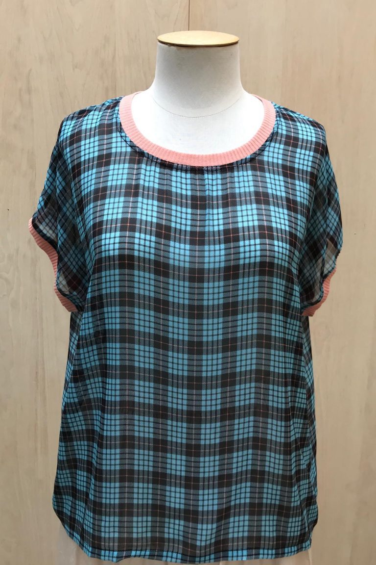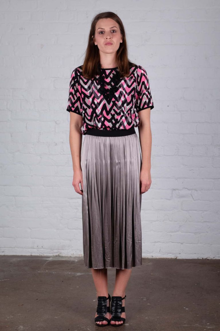 Wallace Rose Clara 100% polyester semi-sheer textured shift dress with gathered sleeve and pleat front detail.
