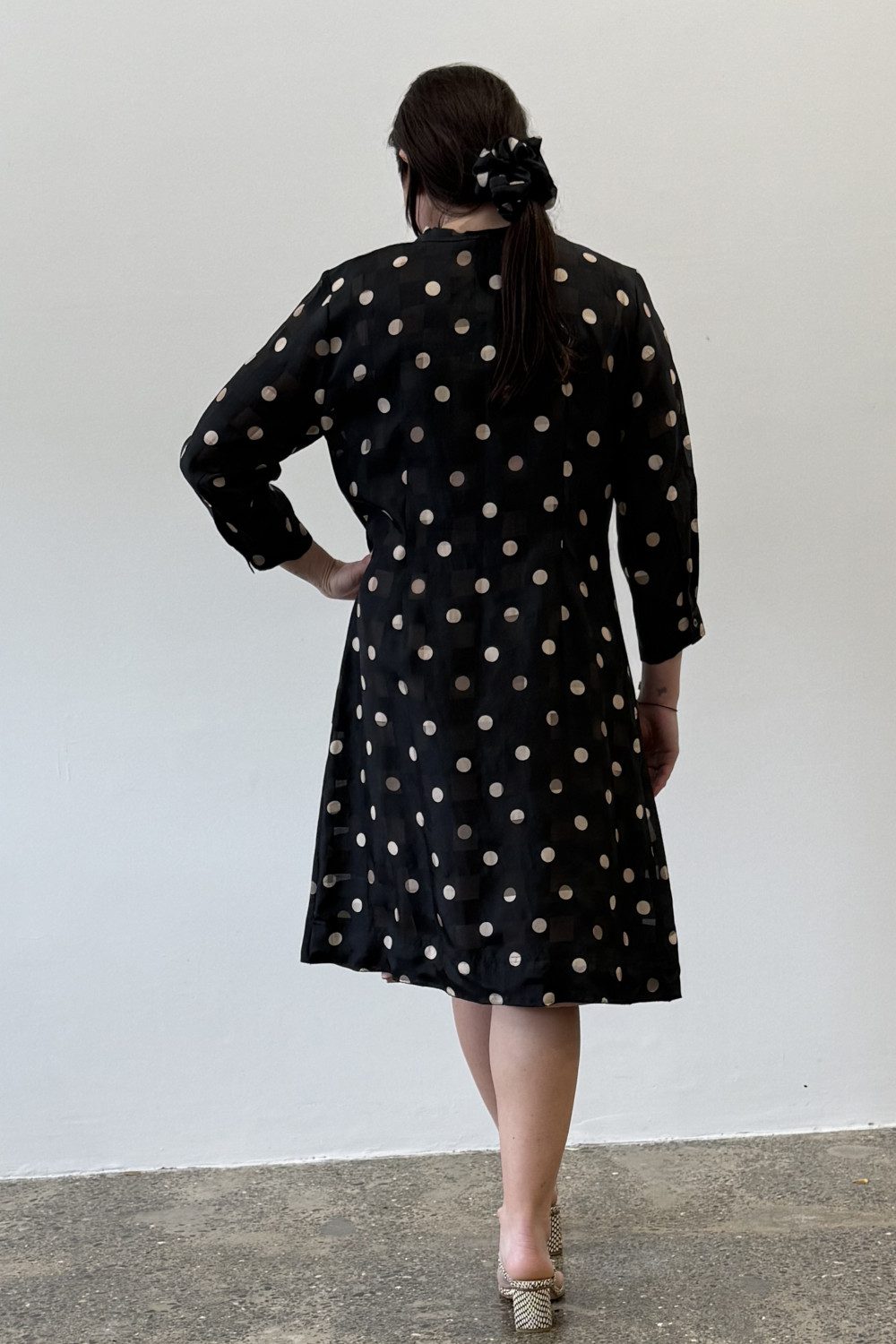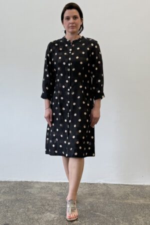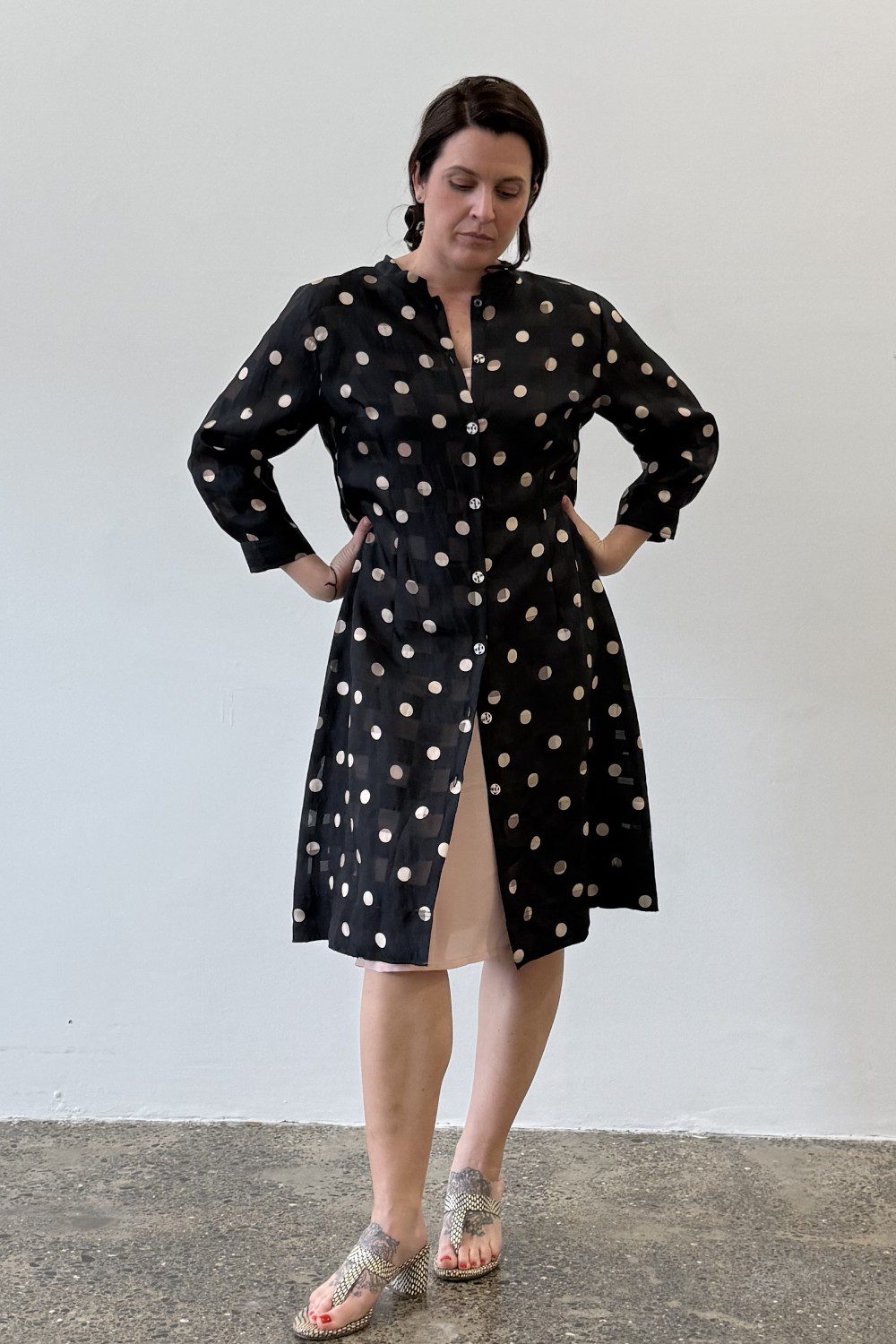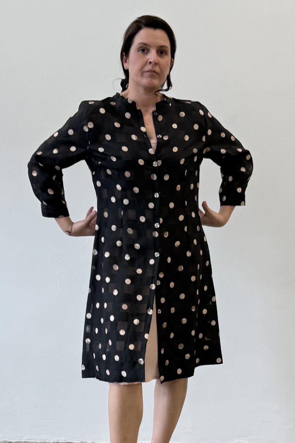 Wallace Rose Coco 100% silk organza spot button through semi-sheer fitted dress with mandarin collar and long sleeves.