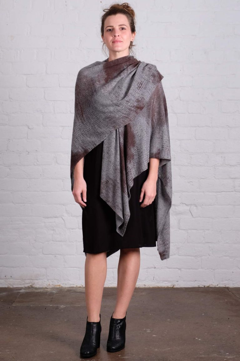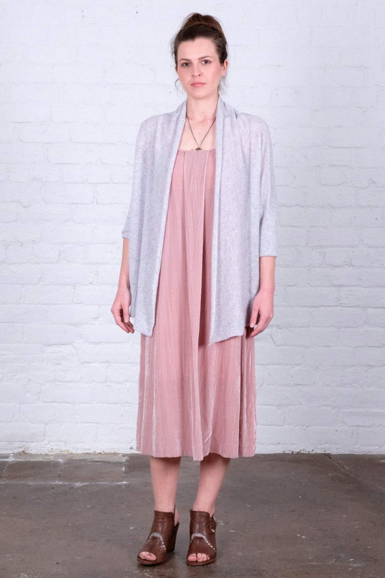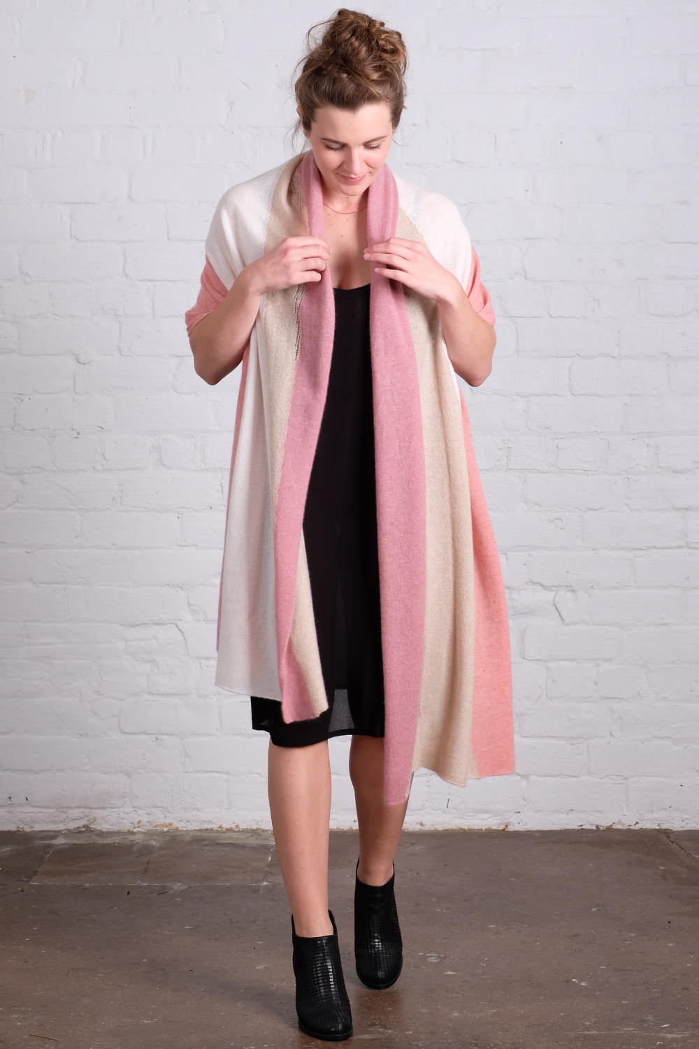 Wallace Rose Cocoon 100% cashmere pink and ivory stripe wrap. Worn over Belinda 100% viscose black slip with adjustable straps.