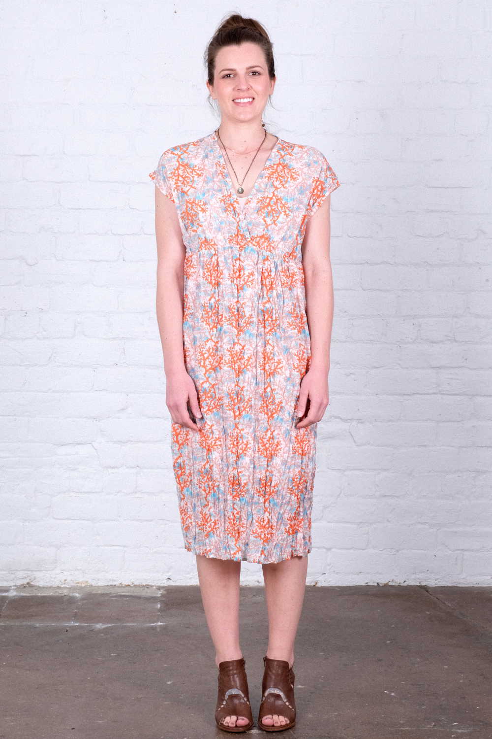 Wallace Rose Coral 70% viscose and 30% silk coral print v-neck gathered empire dress.