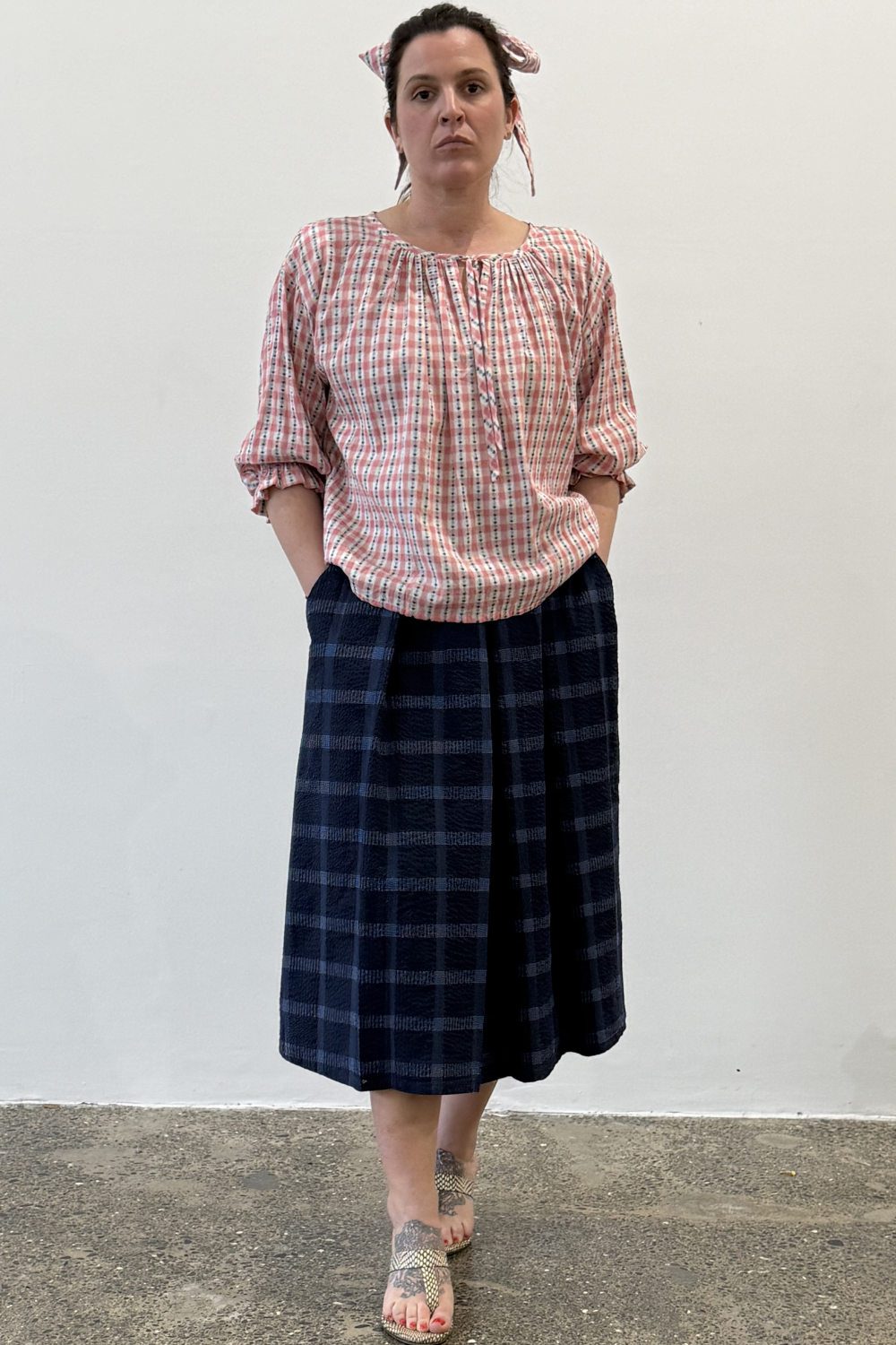 Wallace Rose Flora 100% cotton woven check gathered tunic top with adjustable neck tie.