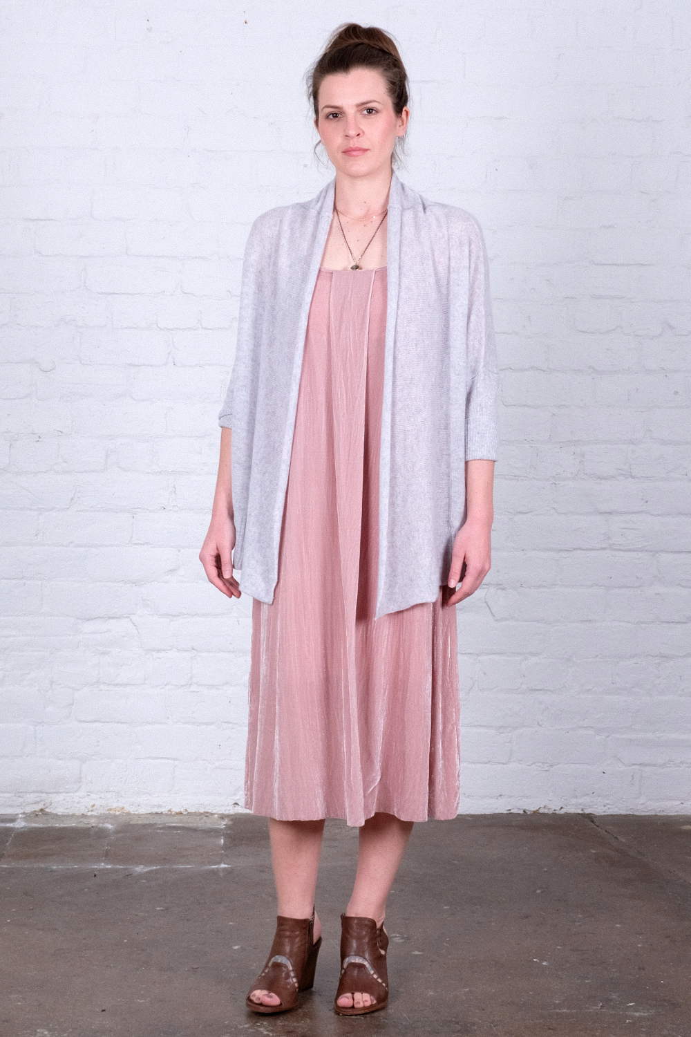 Wallace Rose Gloria 30% silk and 70% viscose velvet pink slip dress with side split and front pleat detail. Worn with 100% cashmere silver open cardigan.