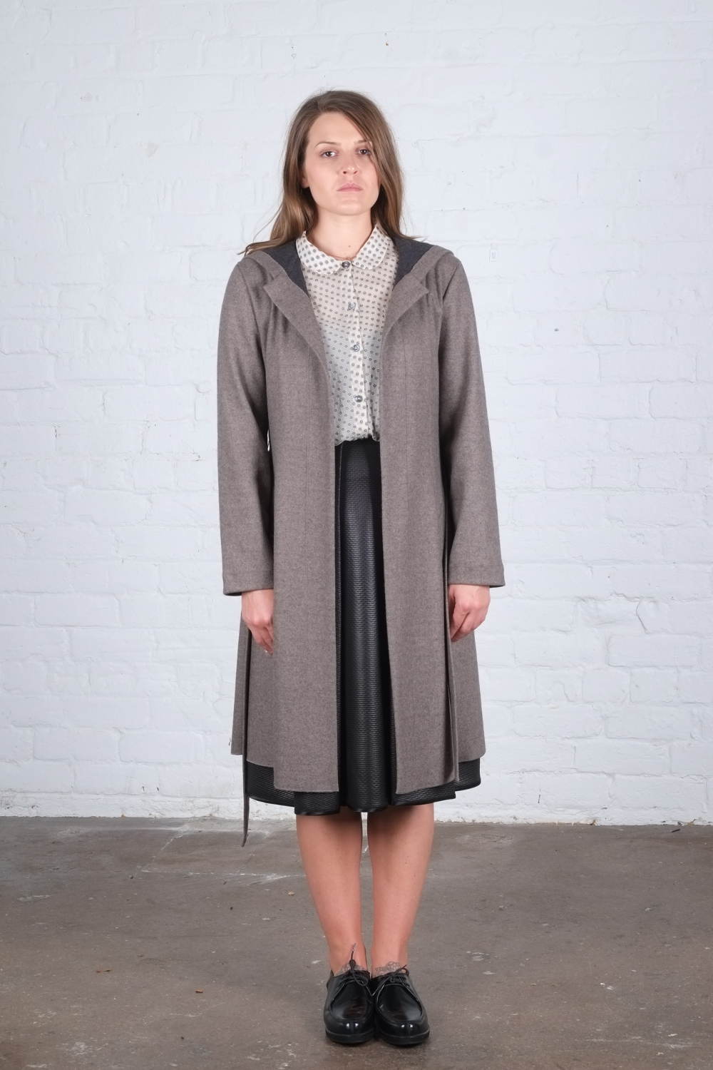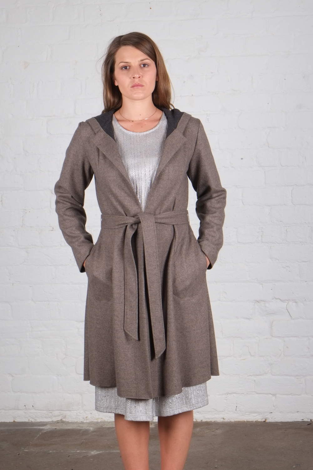 Wallace Rose wool and mohair taupe semi-fittied coat with front patch pockets, charcoal lined hood and belt.