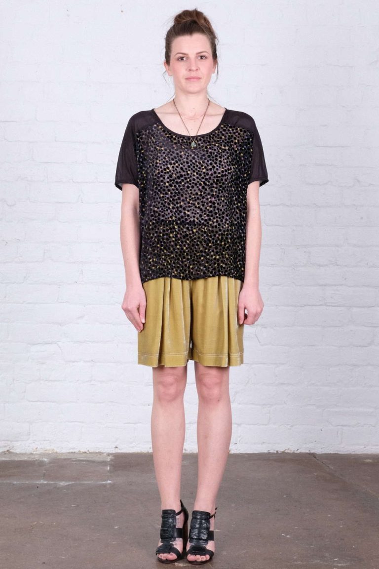Wallace Rose Kara 30% silk and 70% viscose semi sheer flocked black and beige velvet spot top with plain black back. Worn with Velvet 30% silk and 70% viscose velvet gathered shorts.