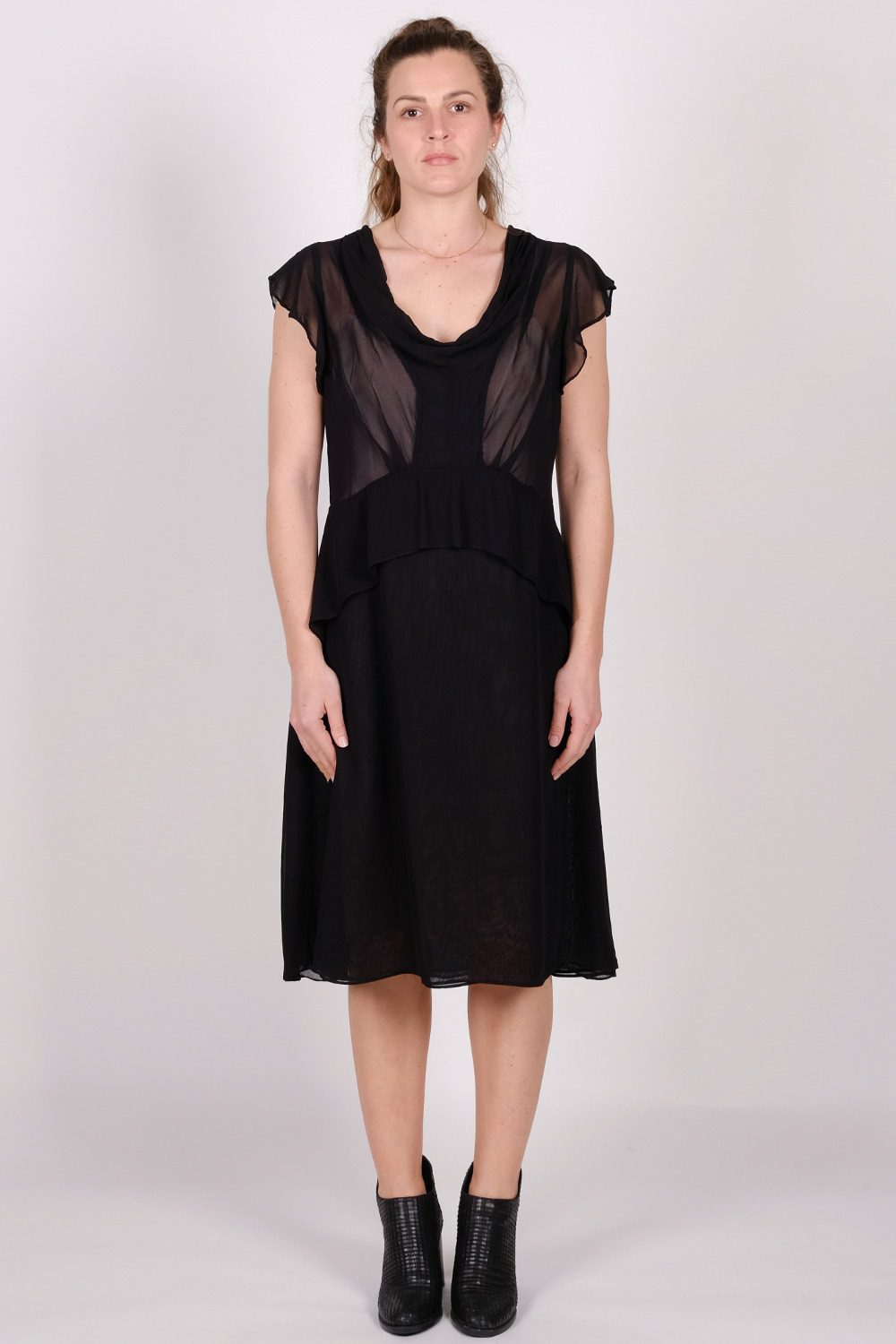 Wallace Rose Katie 100% viscose black vintage inspired dress with sheer ruffle bodice, sleeve and peplum, side zip and double layered bottom.