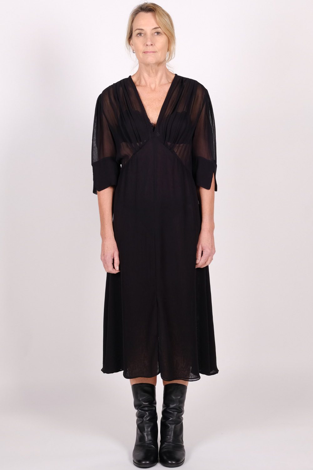 Wallace Rose Kristina 100% viscose black vintage inspired dress with sheer fine pleat bodice, waist detail, side zip and double layered bottom.