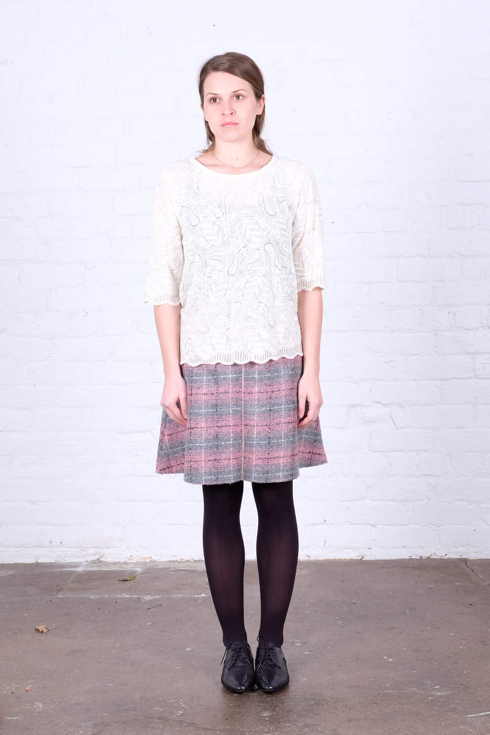 Wallace Rose viscose and cotton applique cream lace semi-fitted top. Worn over Janie plaid lined wool skirt.