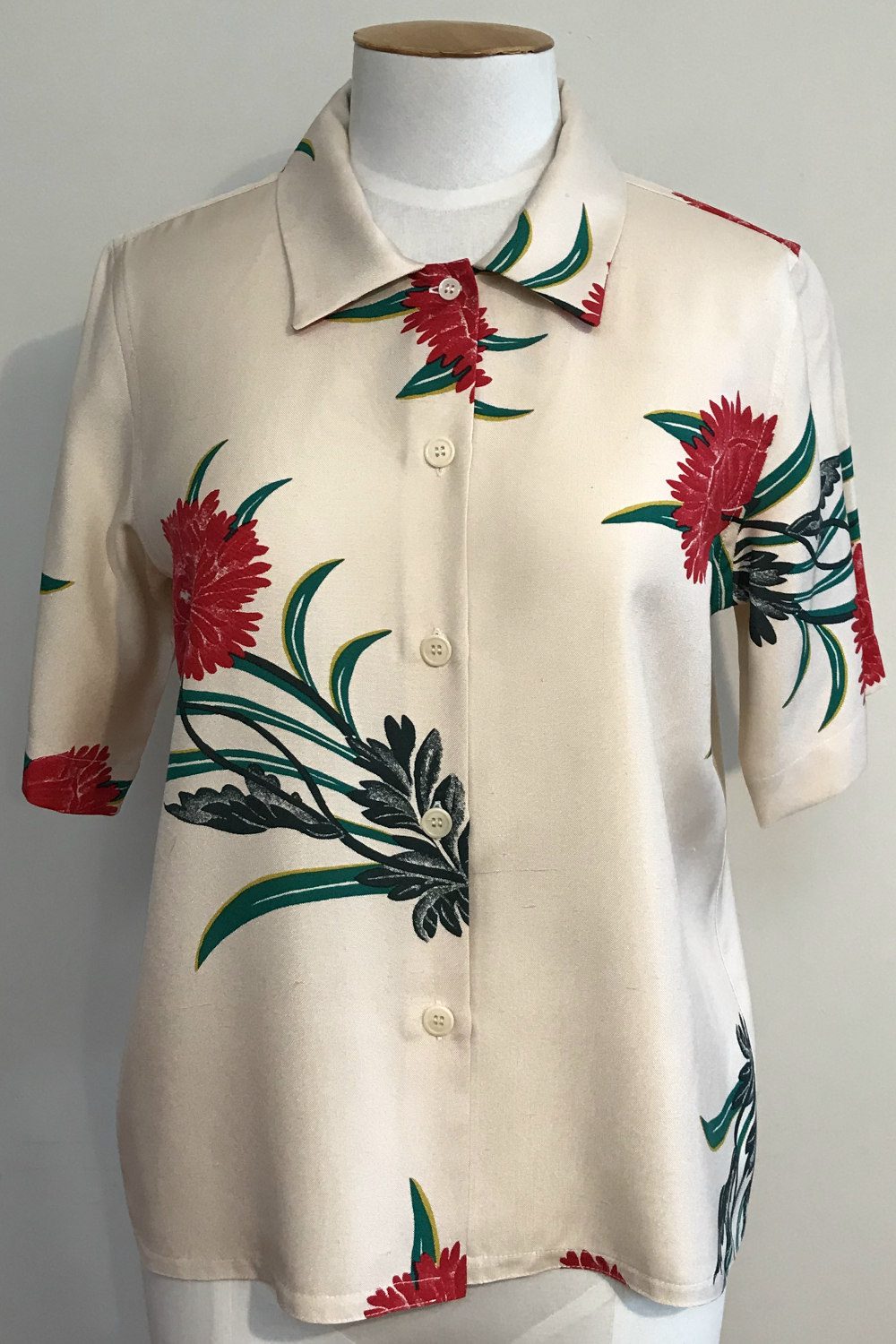 Wallace Rose Lani 100% silk lustre bold floral print easy fitting button up short sleeved shirt.