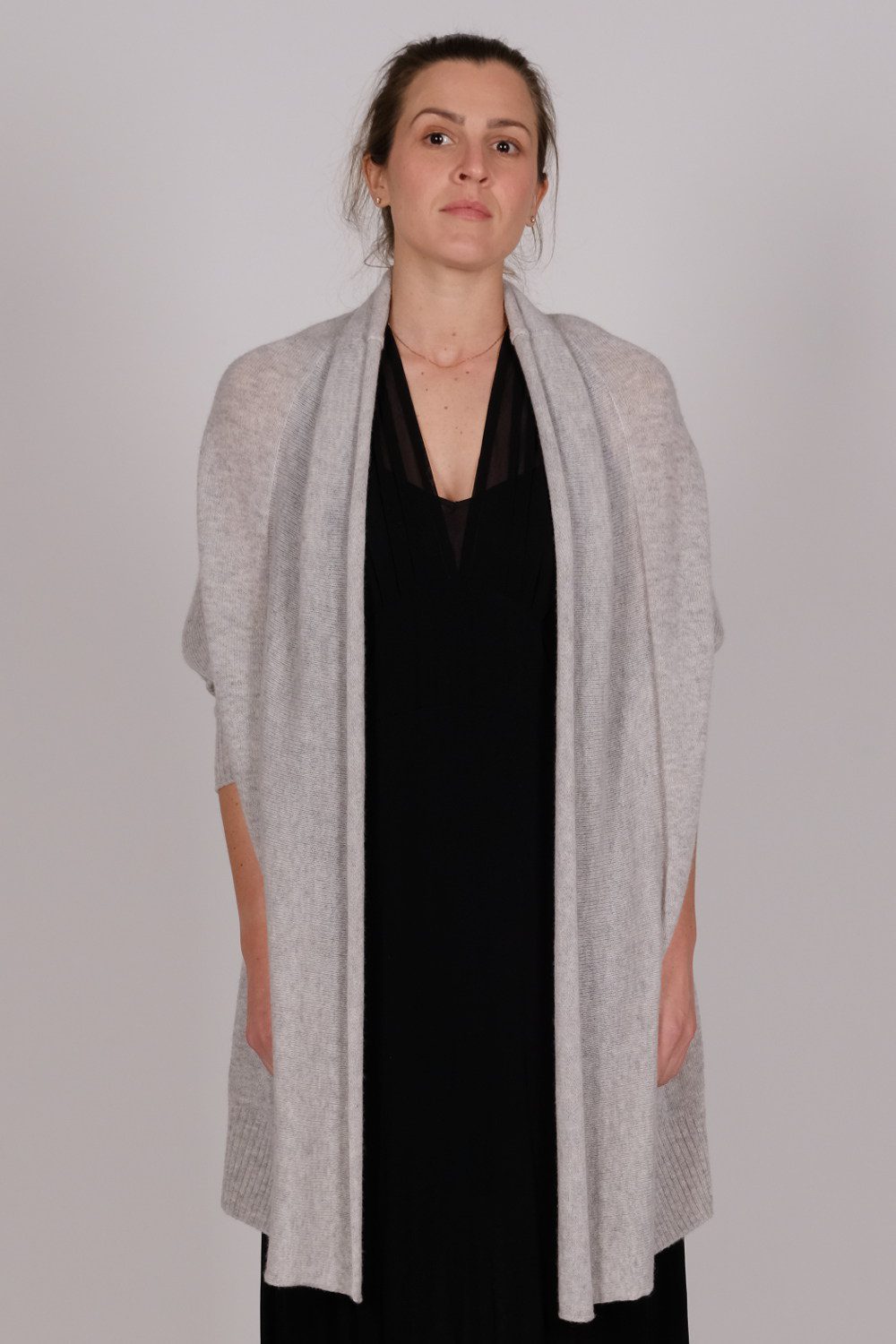 Wallace Rose Luxury imported 100% cashmere pale grey long wrap cardigan. Worn over Rachael 100% rayon black vintage inspired full length maxi dress with sheer fine pleat bodice, waist detail, side zip and double layered bottom.