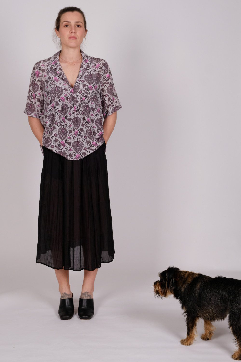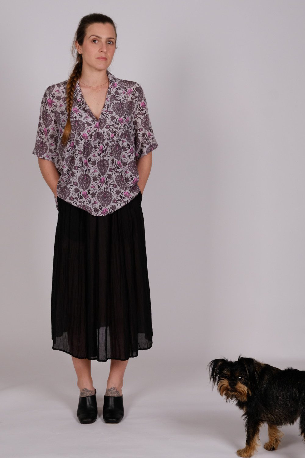 Wallace Rose Mara 100% silk print tunic shirt with ruffle and pleat front detail. Worn over Lucetta 50% silk/ 50% cotton black gathered skirt on elastic waistband, lined with pink cotton lining.