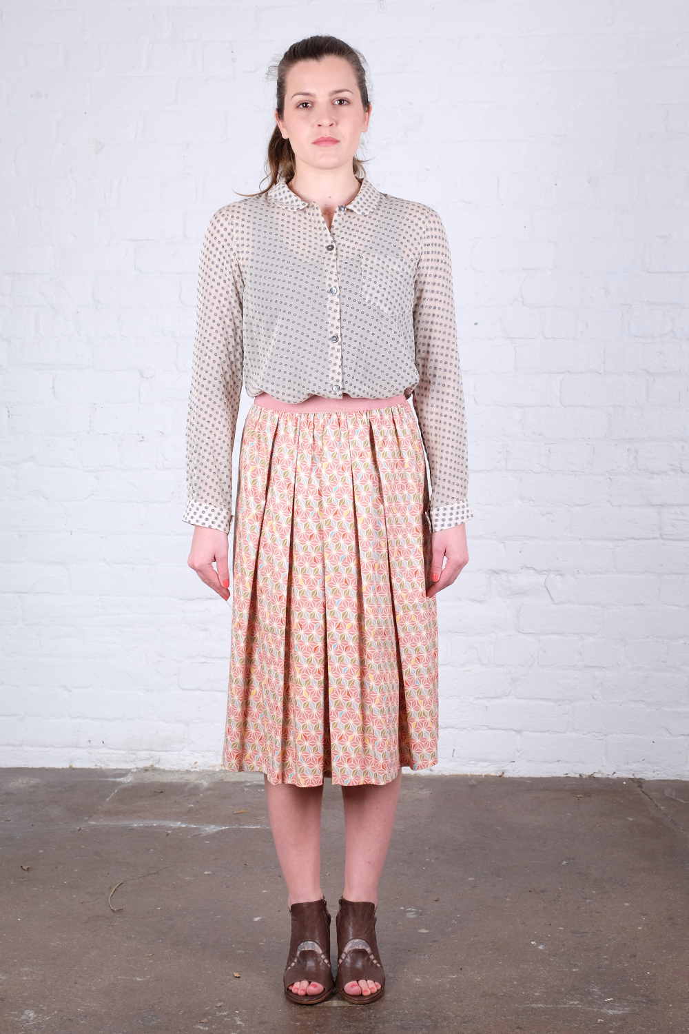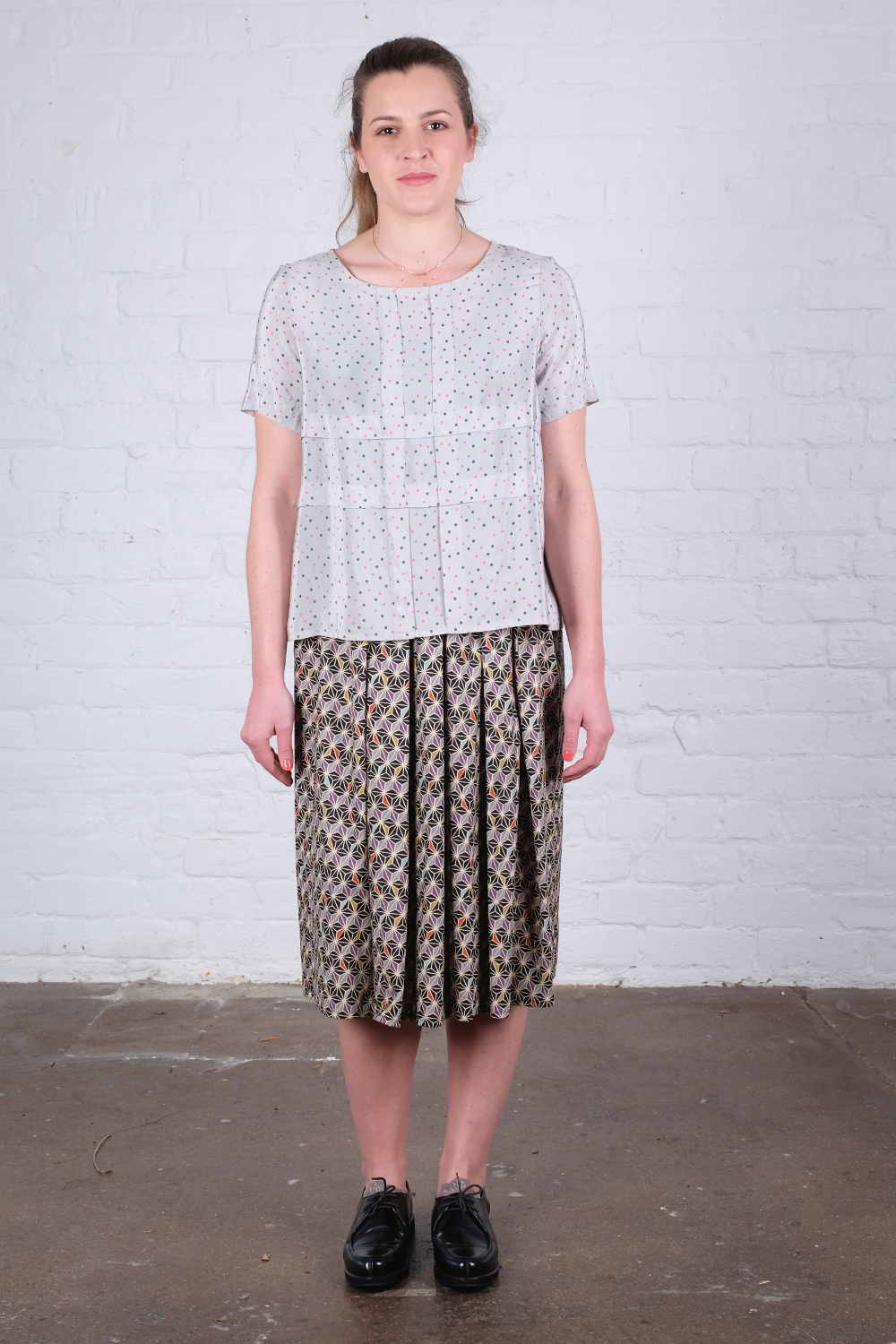 Wallace Rose’s cream spot silk short sleeved, boxy top with round neck and pleat detailing. Worn over Minako japanese cotton black print pleat front skirt with black wide elastic waistband and gathered back.