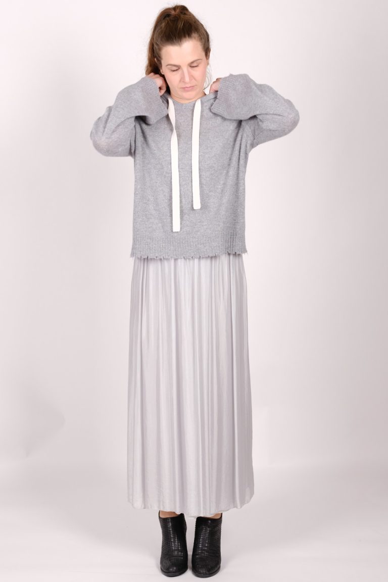 Miss Rose 100% cashmere cardigan with frayed neck and hem detail. Also available in black. Designed in America. Worn with Patty 100% viscose pleat front elasticated waist ankle length trouser and 100% Cashmere stripe scarf.