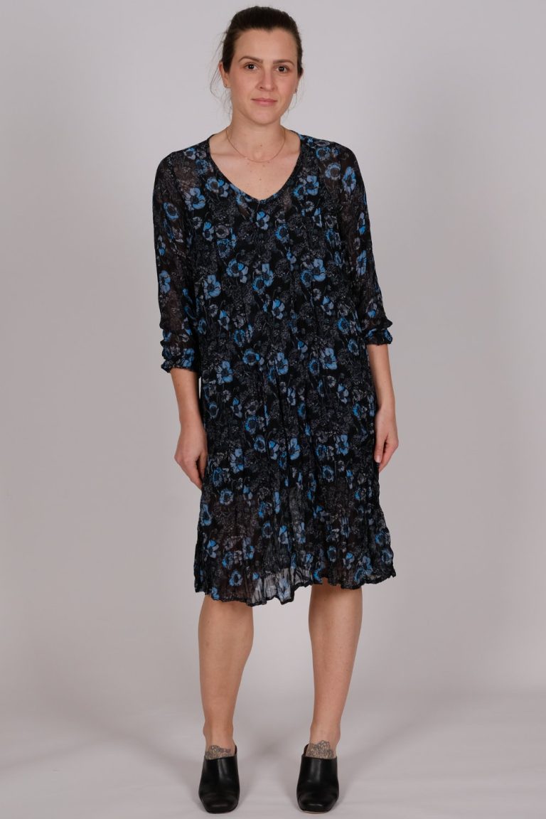Black polyviscose checkerboard satin and semi-sheer print shift dress with sleeve and front pleat detail.