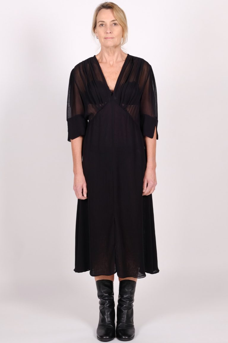 Wallace Rose Ronda 99% wool & 1% metallic wide roll neck easy fitting top with flared sleeve. Worn over Odessa 100% silk gathered semi-sheer maxi skirt on viscose/elastane stretch band with viscose elastane stretch lining.