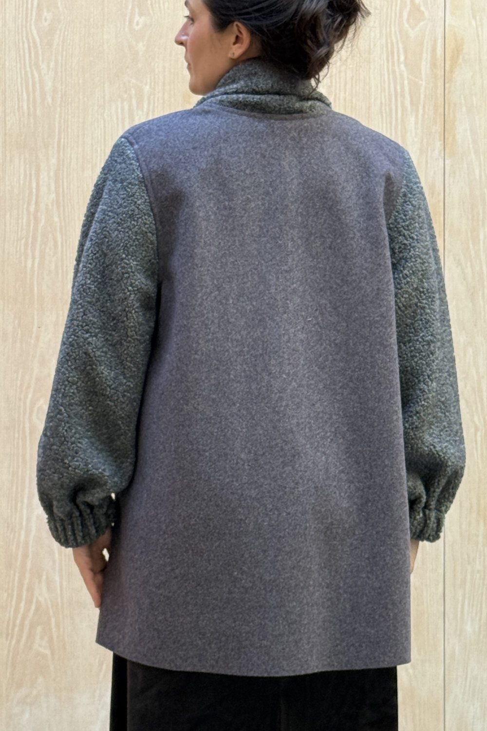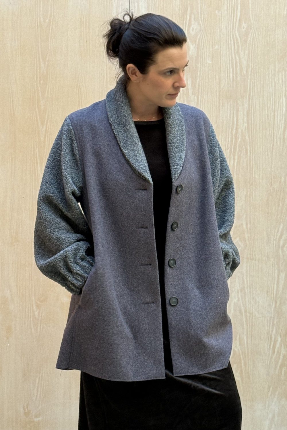 Wallace Rose Shirling 100% wool shawl collar coat with 50/50 wool nylon textured gathered sleeves and side pockets.