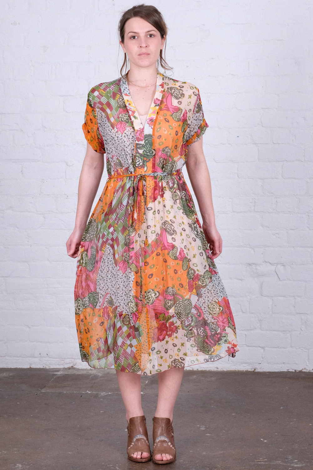 Wallace Rose Vita 100% silk semi-sheer floral print belted swing dress.