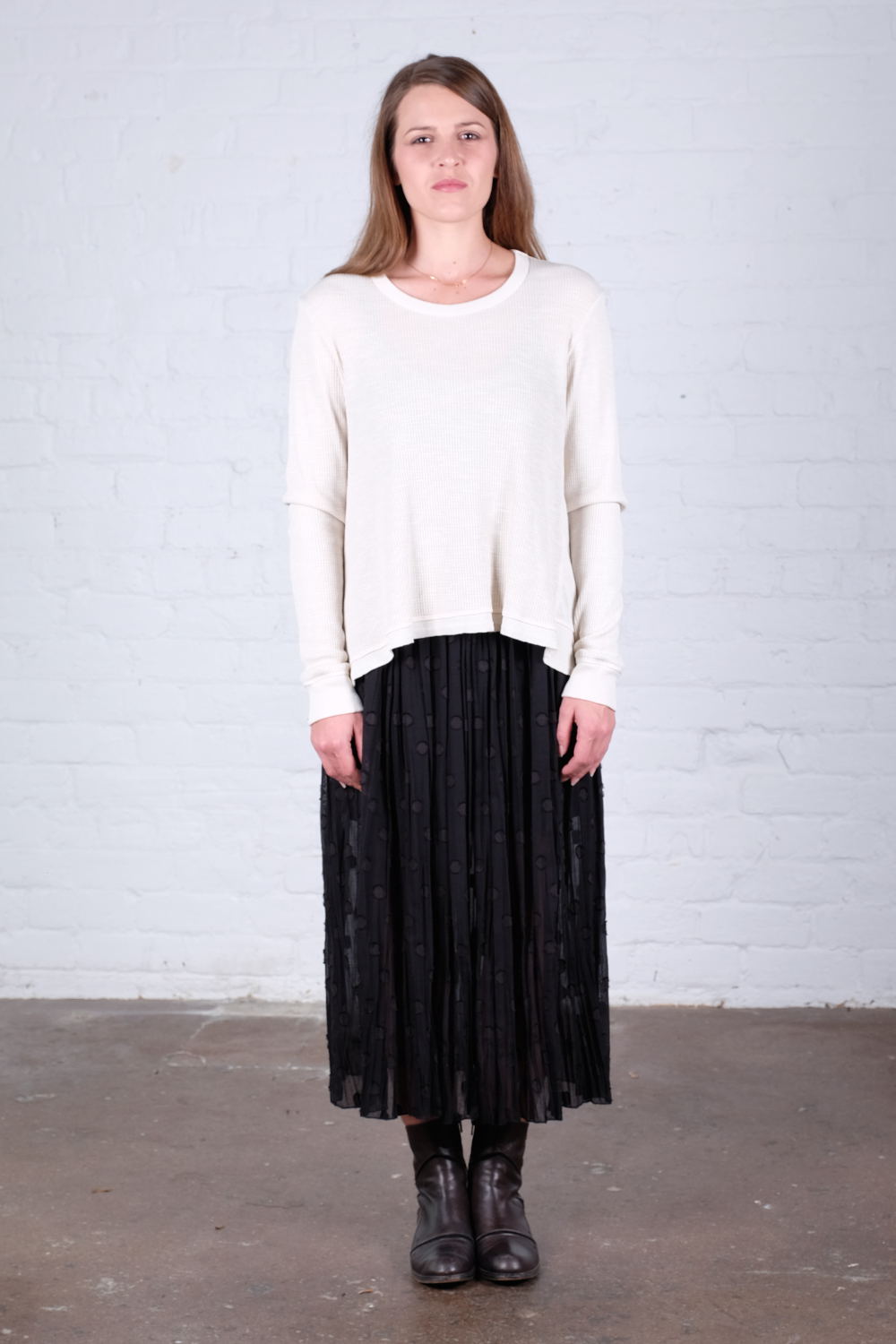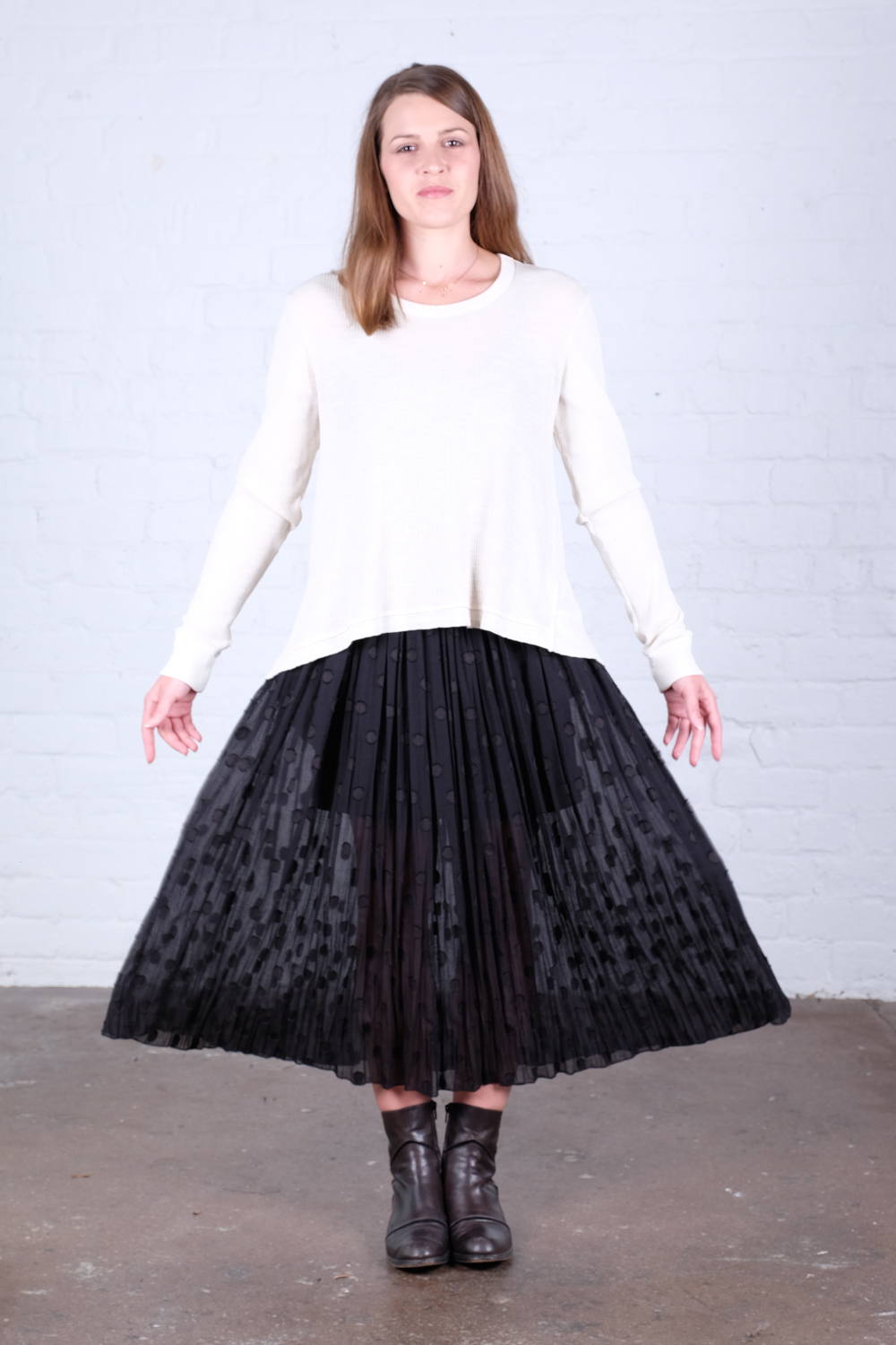 Wallace Rose cream waffle cotton long sleeved top worn over Lola polyviscose black sheer spot gathered skirt.